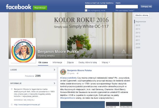 Ta strona to przede wszystkim porady i ciekawostki Betty Moore, ale również prezentacja ciekawych miejsc i salonów z farbami, nowinki ze znanych blogów wnętrzarskich, najnowsze trendy kolorystyczne, informacje o promocjach w salonach Benjamin Moore… Profil prowadzony ze smakiem i klasą.