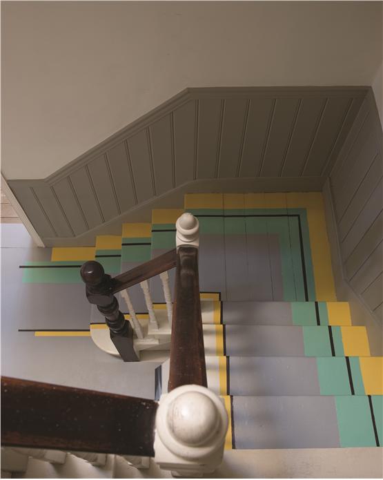 8) Schody, które przykuwają uwagę. Cztery intrygujące kolory: Dove Tale, Arsenic, Mahogany i Babouche plus Off White na ścianie. Autor: Farrow & Ball