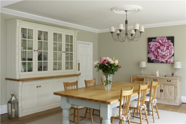 12) Pastelowa jadalnia – na ścianie Clunch, na suficie i na kredensie Wimborne White, na stole Pale Powder, zaś wykończenia w odcieniu All White. Autor: Farrow & Ball