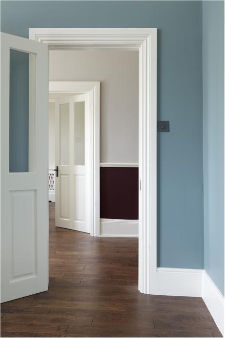 16) Pomysł na hall: na ścianach farby w kolorach Oval Room Blue, Cornforth White i Brinjal, stolarka w odcieniu Wimborne White. Autor: Farrow & Ball