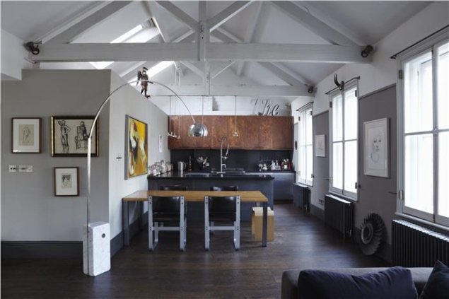 20) Nowoczesna kuchnia – na ścianach Lamp Room Gray, szeroki pas nad podłogą w odcieniu Down Pipe, zaś na suficie – Strong White. Autor: Farrow & Ball