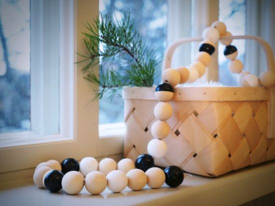 2. Łańcuch wykonany z drewnianych kulek (do kupienia np. w sklepach z materiałami dekoracyjnymi lub akcesoriami do wyrobu biżuterii) będzie się pięknie prezentował, jeśli kulki zanurzymy w dwóch farbach o kontrastowych kolorach, jasnym i ciemnym. Możemy zanurzyć je w całości lub do połowy.