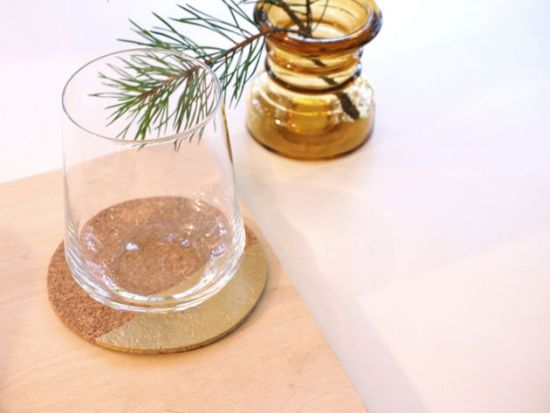 6. W podobny sposób można też ożywić korkowe podkładki pod kubki i szklanki. Zanurzone do połowy lub w 1/3 w perłowej albo matowej farbie w ciągu kilku sekund zamienią się w intrygującą ozdobę stołu.