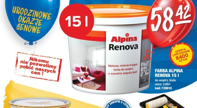 Urodzinowa promocja objęła między innymi białą farbę do wnętrz Alpina Renova – cena 58,42 zł za opakowanie 15 l (cena za litr: 3,89 zł). Trzeba się jednak spieszyć, ponieważ to oferta limitowana – w specjalnej niższej cenie dostępnych jest tylko 8400 sztuk!