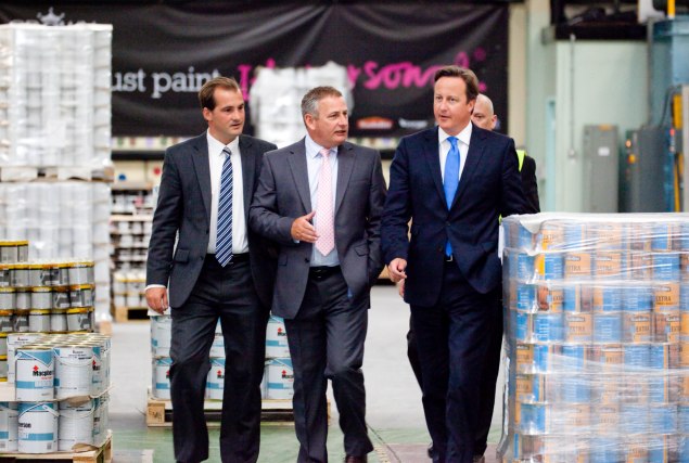 W trakcie wizyty, która odbyła się 9 sierpnia 2013, premier David Cameron odbył wycieczkę po zakładzie produkcyjnym Crown Paints, gdzie produkowane są najbardziej znane marki farb – Crown i Sandtex – i odpowiedział na pytania pracowników podczas zorganizowanej sesji. W swej przemowie do słuchaczy podkreślił, jak ważnym jest, by w Wielkiej Brytanii powstawało więcej przedsiębiorstw takich jak Crown Paints. Nieustanny rozwój, produkcja i sprzedaż, zarówno w kraju jak i za granicę, a także dobre programy szkoleń, by przygotować do pracy młodych ludzi – oto przedstawione przez niego priorytety rządu.