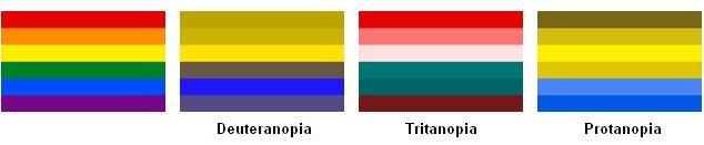 Barwy widziane oczyma osób ze ślepotą barw. Od lewej: obraz widziany prawidłowo, następnie przez osobę z deuteranopią (nie rozpoznającą zielonego), z tritanopią (nie rozpoznającą niebieskiego) oraz z protanopią (nie rozpoznającą czerwonego). Fot. Wikimedia Commons