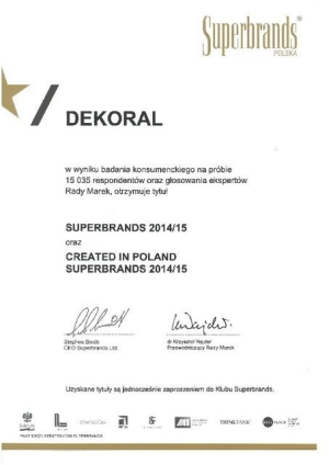 Dekoral znalazł się na niej już po raz czwarty. Oprócz tego otrzymał również tytuł Created in Poland Superbrands 2014/2015, przyznawany markom powstałym w Polsce. Anna Łatoszyńska, manager marki Dekoral, w imieniu całego zespołu wyraziła radość z powodu wyróżnienia i stwierdziła, że jest to potwierdzenie szacunku i zaufania, jakim cieszą się farby Dekoral na naszym rynku. Specjaliści marki pilnie śledzą najnowsze trendy kolorystyczne i dekoracyjne i wykorzystują te informacje, by budować ofertę spełniającą oczekiwania klientów.