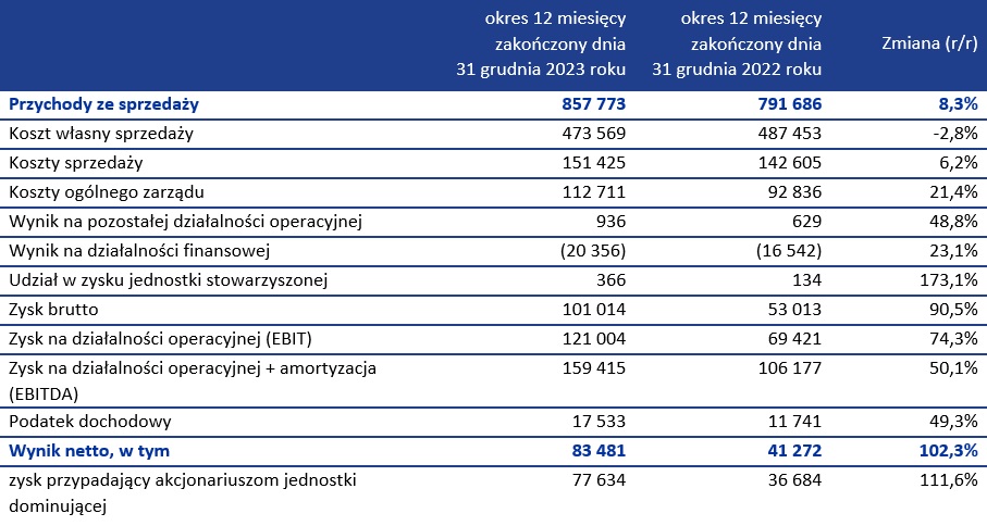 Wzrost sprzedaży był w dużej mierze napędzany zwyżką obrotów o 10% rok do roku na kluczowym dla Grupy rynku polskim. Wartość sprzedaży krajowej osiągnęła 591,1 mln zł, co stanowiło 69% skonsolidowanych przychodów. W Ukrainie, po wcześniejszym okresie spadków, Grupa odnotowała znaczące zwiększenie przychodów w porównaniu z rokiem poprzednim. Sprzedaż na tym rynku wyniosła 88,4 mln zł, co oznacza wzrost o 29,6% wobec 2022 roku. Natomiast na Węgrzech wysoka inflacja, która w 2023 roku osiągnęła poziom 17,6%, miała negatywny wpływ na siłę nabywczą konsumentów. W konsekwencji przychody z rynku węgierskiego spadły o 6,3% rok do roku osiągając wartość 128,2 mln zł.