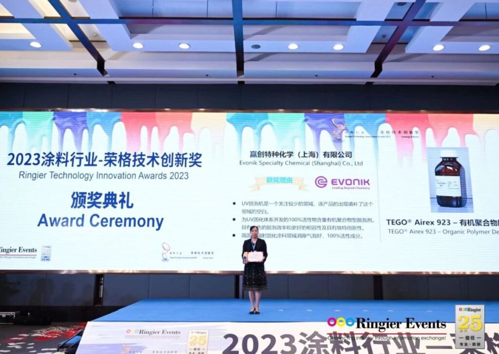 Nagrodę Ringier Coating Technology Innovation Award 2023 zdobył dodatek TEGO® Airex 923 marki Evonik. Ten środek odpowietrzający, zaprojektowany specjalnie z myślą o powłokach sieciowanych UV, charakteryzuje się wysoką skutecznością i kompatybilnością.