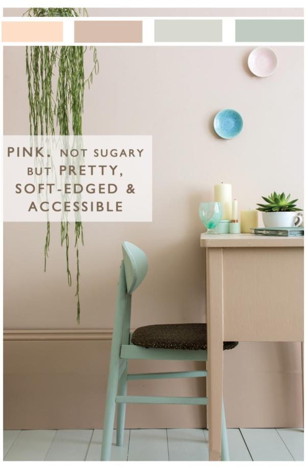 Ten delikatny różowy odcień sprawia, że wnętrze prezentuje się pięknie i dyskretnie. Jest ciepły, ale nie słodki czy infantylny. By zachować równowagę, dobrze skontrastować go z silniejszym kolorem, takim jak Setting Plaster. Dobrze prezentować się będzie pomalowana farbą w tym odcieniu stolarka. Dodatkowe, zbliżone do Pink Ground barwy powinny być miękkie i lekko chmurne, tak jak Pale Powder, który sprawdzi się zarówno na podłodze jak i na meblach.