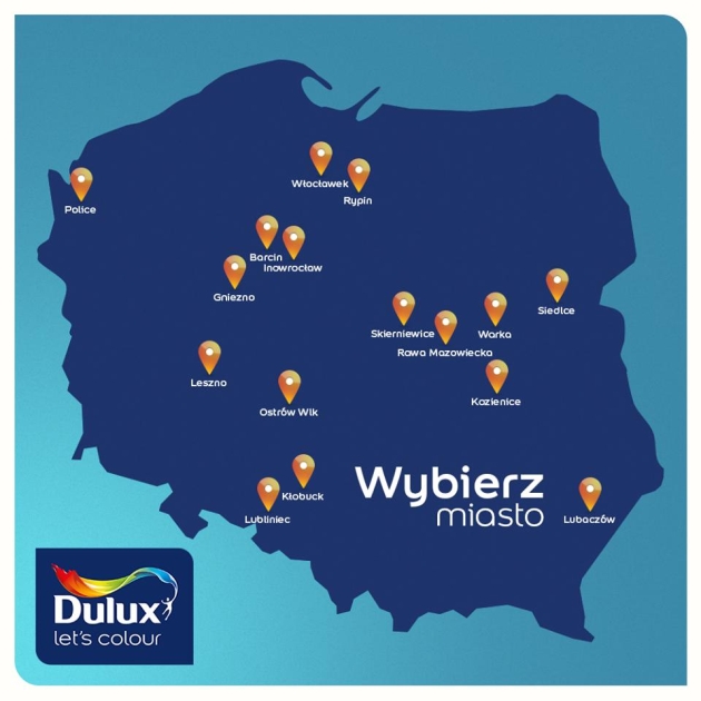 ale pozostałe miasta nadal mają szansę! Głosowanie kończy się o północy 14 lipca, więc jest jeszcze dużo czasu na oddanie swojego głosu i wsparcie miast, które według internautów zasługują na odwiedziny Dulux Let’s Colour. Głosować można za pośrednictwem strony Duluxa na portalu Facebook.