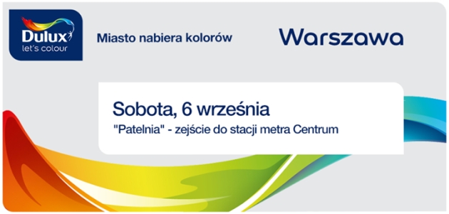 Dulux Let's ColourW imieniu ekipy Dulux Let’s Colour i organizatorów akcji Warszawa jest Trendy wszystkich warszawian zapraszamy na wspólne malowanie w najbliższą sobotę, 6 września 2014. Specjalny mural przyozdobi Patelnię – zejście do stacji metra Centrum. Start o godzinie 11!
