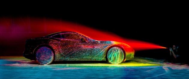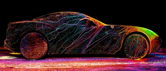 Artysta ten to Fabian Oefner. Włoski producent udostępnił mu jeden ze swoich samochodów Ferrari California T na potrzeby pewnego artystycznego projektu. Wydawał się bardzo prosty – umieścić samochód w tunelu aerodynamicznym i spryskać farbami UV.
