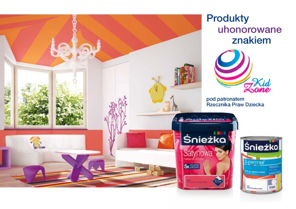 Farby Śnieżka Satynowa i Śnieżka Supermal® Emalia Akrylowa otrzymały certyfikat KidZone – znak jakości przyznawany przez Rzecznika Praw Dziecka produktom w pełni bezpiecznym dla dzieci.