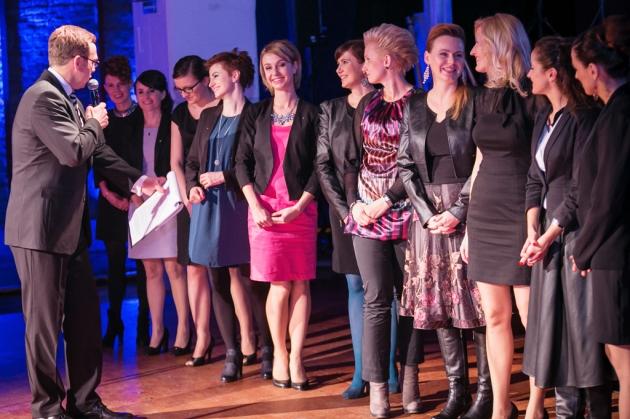 Maciej Orłoś przedstawia gościom zatrudnione w firmie Jotun panie, które pozowały do nowego kalendarza.
