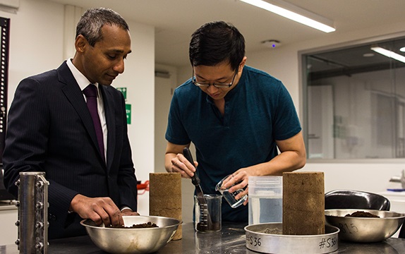 Prof. Arulrajah i doktorant Teck-Ang Kua przygotowują mieszankę na podkład pod drogi. Fot. arch. Swinburne University of Technology