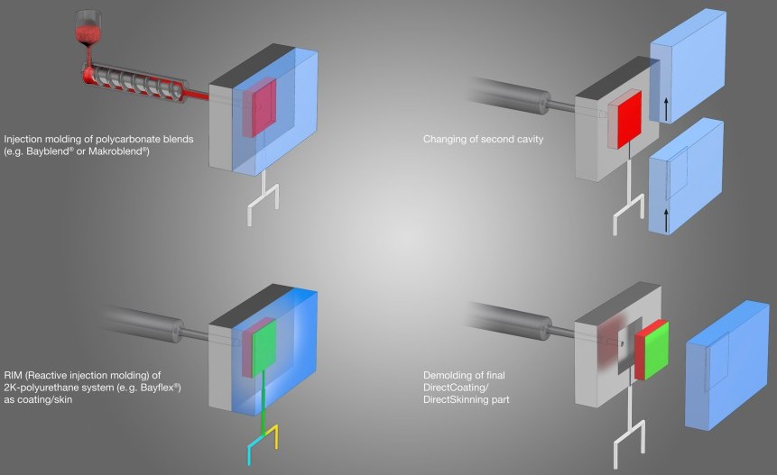 Cały proces dobrze prezentuje ilustracja. W pierwszej jego fazie termoplastyczny polimer jest wtryskiwany do zagłębienia w jednej części formy. Następnie druga część formy zostaje wymieniona na matrycę wyposażoną w płaską wnękę, do której trafia z kolei dwuskładnikowa farba poliuretanowa. Po zastygnięciu otrzymujemy element pokryty farbą, który możemy od razu poddać dalszej obróbce.