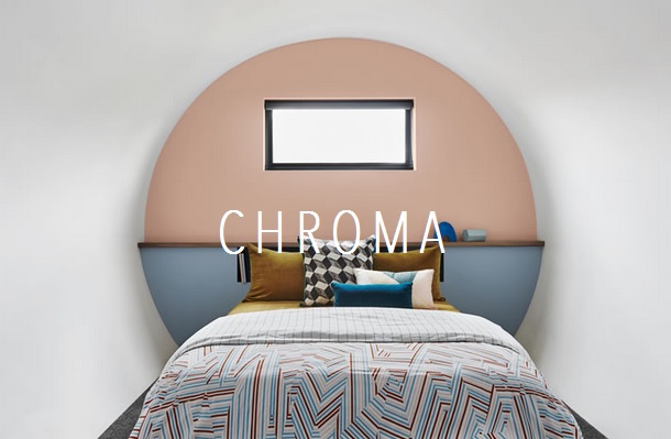 Chroma to propozycja dla znudzonych kojącymi, pastelowymi wnętrzami. Królują tu żywe, nasycone odcienie – brzoskwinia, melon, żółty, zielony, niebieski – oraz formy graficzne. Na pewno nie będzie nudno!