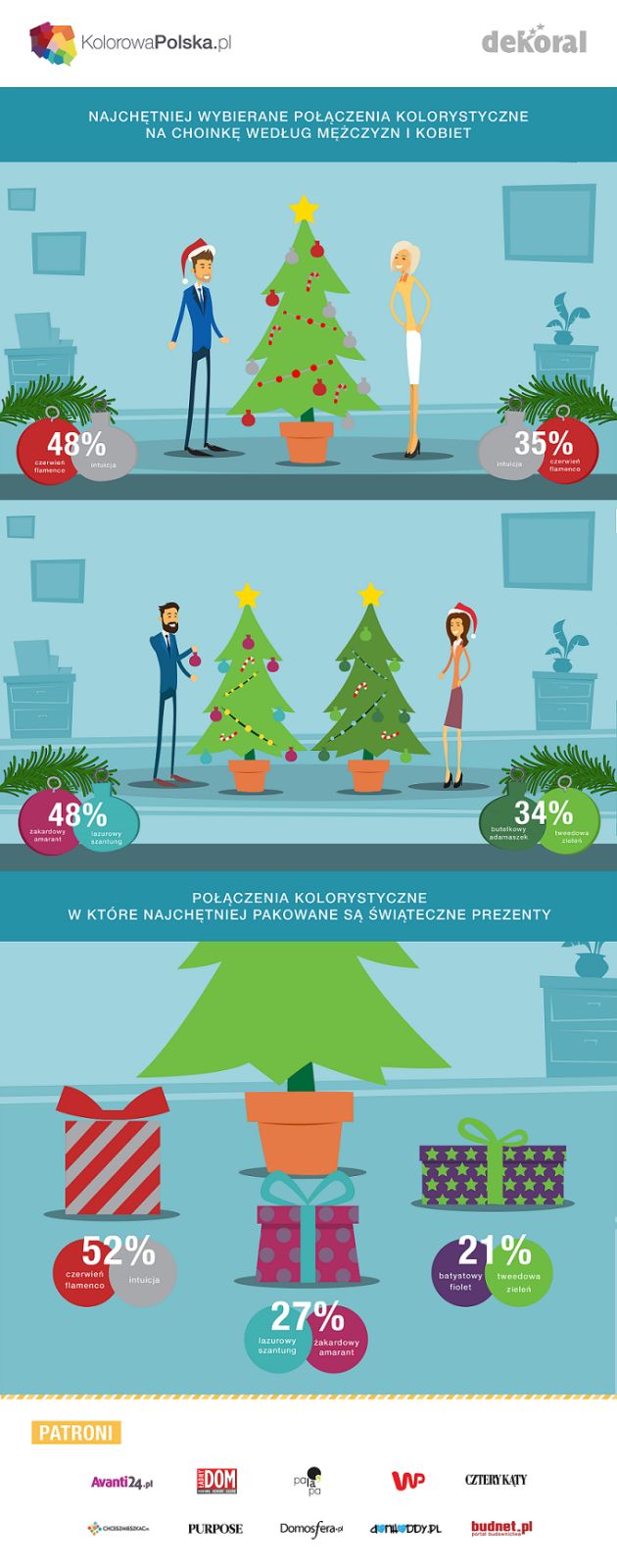 Do dekoracji stołu kolor czerwony wybiera 56% ankietowanych, biały – 50%, złoty – 45%, srebrny – 35%, a prócz tego popularny jest także zielony – 20%. Jeśli zaś chodzi o choinkę, czerwone ozdoby wybiera 51% osób, złote – 49%, srebrne – 41%, białe – 39%. Popularne, ale już w dużo mniejszym stopniu, są również odcienie niebieski (13%) i fioletowy (7%).