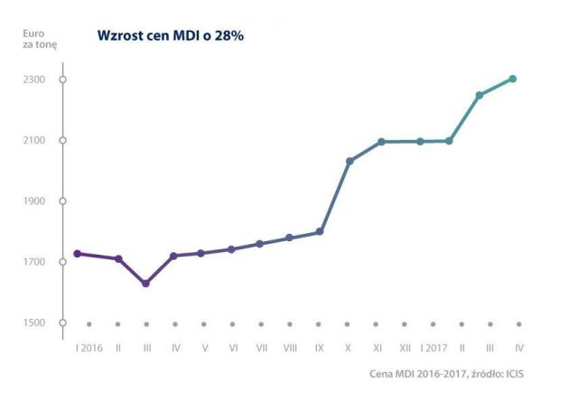 Ceny surowców wzrastają średnio o kilkanaście procent, są jednak składniki, które znacząco zawyżają ten odsetek. Np. wspomniany wcześniej izocyjanian MDI – prawie 30%, SBS, dla którego wahania cen od początku roku wynosiły od 40 do 50% lub rozpuszczalnik MEK ze średnim wahaniem 61% (oba surowce to składniki klejów rozpuszczalnikowych). Ceny asfaltów do produkcji membran w hydroizolacjach bitumicznych również wzrosły o 40-50%.