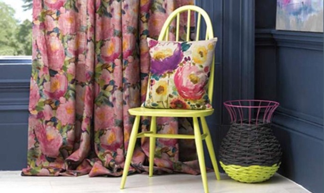 Contemporary Florals – czyli motywy kwiatowe w nowoczesnej odsłonie. Tłem dla kwiecistych zasłon i poduszek jest ciemnoniebieski Stiffkey Blue, zaś odrobinę słońca wprowadza do całej kompozycji krzesło pomalowane na żółto (Yellowcake).