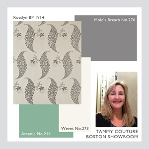 Elegance & Drama – elegancka kompozycja opierająca się na połączeniu tapety Rosslyn z szarą farbą Mole’s Breath. Elementy wyposażenia pomalowane farbą Wevet podkreślą schludność wystroju. Aby przełamać szarą powagę warto dorzucić odrobinę żywej zieleni Arsenic.