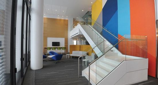 Szkło Sungate i Starphire Ultra-Clear to nie jedyne produkty PPG, jakie wykorzystano przy budowie niezwykłego biurowca. Do pokrycia paneli metalowych, z których wykonane zostały zewnętrzne i wewnętrzne ściany osłonowe, zastosowano fluoropolimerową farbę proszkową Coraflon w odcieniu Gray Mica. Farba ta nie zawiera rozpuszczalników i charakteryzuje się bardzo niską emisją LZO, a równocześnie jest bardzo trwała i odporna na promieniowanie UV, dzięki czemu zachowuje kolor i połysk na długie lata.
