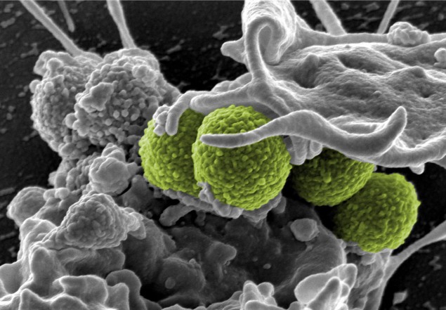 Bakteria MRSA, gronkowiec złocisty oporny na metycylinę, atakowana przez białą krwinkę. Gronkowiec złocisty jest najczęstszą przyczyną zakażeń szpitalnych. Fot. Wikimedia Commons