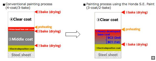 Firma Honda opracowała nową, oszczędną i przyjazną środowisku technologię nanoszenia powłok samochodowych. Procedura ta, nazwana „Honda Smart Ecological Paint”, pozwala wyeliminować jedną z warstw pośrednich systemu powłok, dzięki czemu pokrycie poddawane jest wygrzewaniu jedynie dwa razy, a nie trzy, jak w standardowym procesie.
