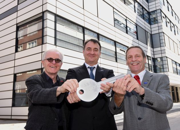 Symboliczne przekazanie kluczy. Od lewej: architekt Bernd Junker, szef działu Advanced Materials & System Research dr Harald Lauke oraz zarządca nowego budynku Klaus Dick. Fot. arch. BASF