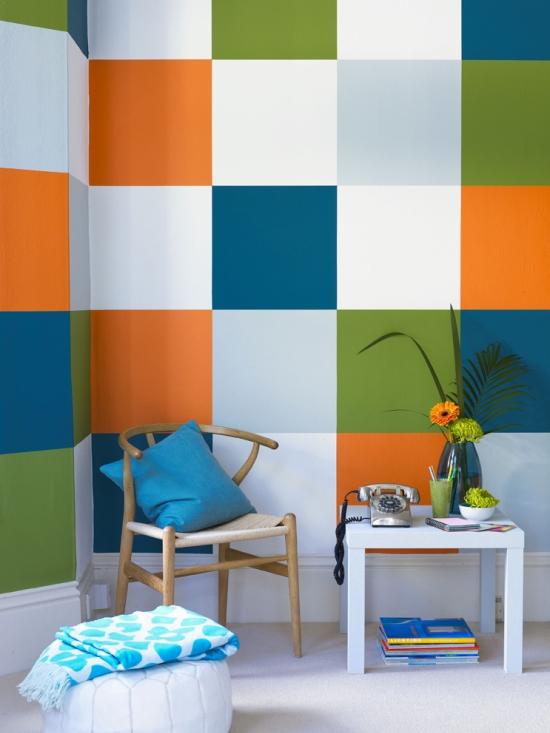 Podobnie jak w poprzednim przypadku chodzi o to, by na ścianie pojawiło się więcej kolorów. Ale tym razem nie musisz się trzymać nudnych linii. Chwyć za taśmę malarską i powyklejaj na ścianie różne zygzaki. Chwyć za ołówek i narysuj na ścianie wielkie koło. Póki kolory wyglądają razem dobrze, wszystkie chwyty dozwolone.
