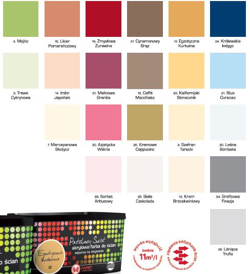 Pastelowy Świat to 22 inspirujące, gotowe kolory farb do ścian, wśród których każdy znajdzie coś dla siebie. Farby oparte są na akrylowych, trwałych żywicach odpornych na zmywanie, co z pewnością sprawdzi się zarówno w przedpokojach, jak i narażonych na trudne warunki pracy i częste zmywanie pokojach dziecinnych. Warto wspomnieć również o optymalnej oddychalności oraz dobrej przyczepności tych akrylowych farb do podłoża. Farby z kolekcji Pastelowy Świat dostępne są w eleganckich opakowaniach o pojemnościach 2,5 lub 5 litrów.