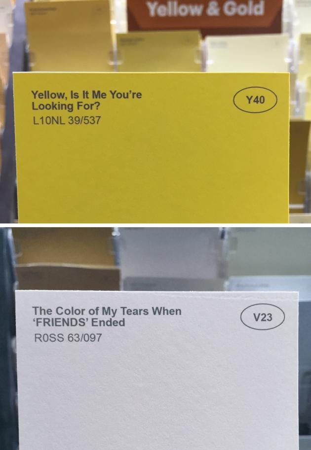 Poszedł więc do sklepu i podmienił karty kolorystyczne z oryginalnymi nazwami na karty opatrzone swoimi własnymi, oryginalnymi pomysłami. Za inspirację posłużyły mu przeróżne rzeczy – nazwiska aktorów, postaci i kultowe cytaty z filmów, fragmenty tekstów piosenek, sytuacje z życia codziennego…