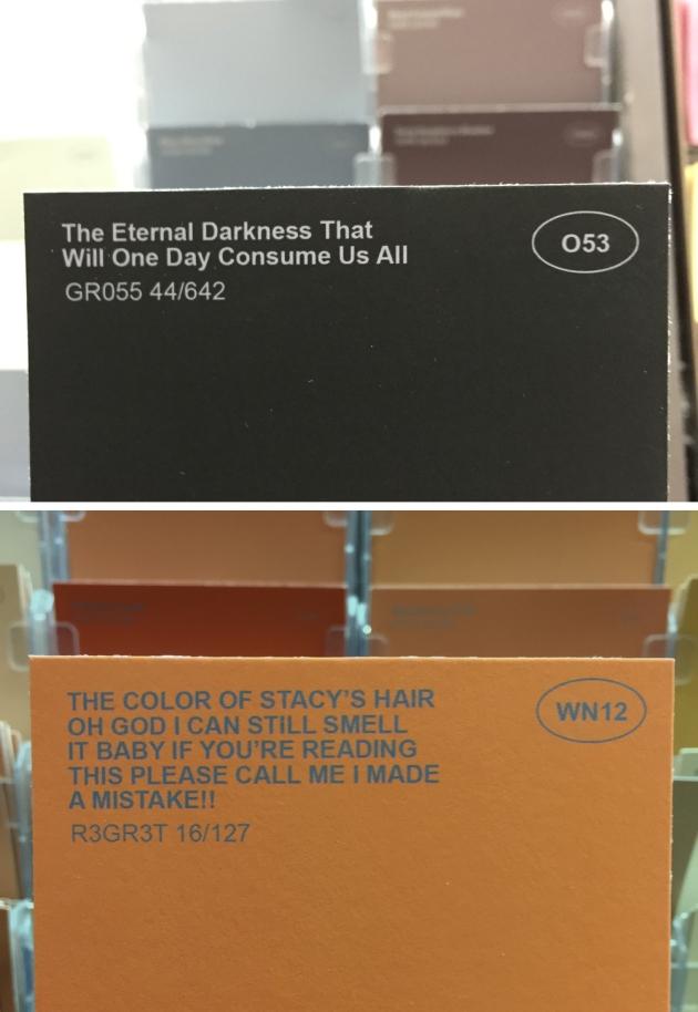 Zamiast białego – Help! I’m A Ghost! They’re Liquifying Us For Our Pure White Color! THEY MUST BE STOPPED! OH GOD PLEASE HELP!!!! Hahaha JK I’m Not A Ghost. It’s Just Me, Jeff, The Guy Who Names These Paint Colors czyli Pomocy! Jestem Duchem! Upłynniają Nas Dla Naszego Czystego Białego Koloru! TRZEBA ICH POWSTRZYMAĆ! BOŻE, POMÓŻ! Hahaha Tylko Żartuję Nie Jestem Duchem. To Tylko Ja, Jeff, Gość Który Nadaje Nazwy Tym Kolorom.