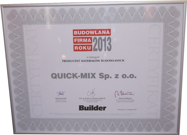 Firma quick-mix znalazła się w gronie wyróżnionych przez czasopismo „Builder” i otrzymała tytuł Budowlanej Firmy Roku 2013.