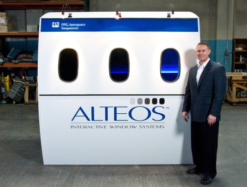 Absolutna nowość opracowana przez PPG Aerospace przy wsparciu firmy Gentex to Alteos™ – pierwszy na świecie komercyjny interaktywny system dla okien pasażerów w samolocie. Szyby są w tym wypadku wykonane z materiału elektrochromicznego – tzn. zmieniającego kolor w zależności od przyłożonego napięcia. W praktyce oznacza to, że jeśli znudzony widokami pasażer ma ochotę uciąć sobie drzemkę, wystarczy że naciśnie odpowiedni przycisk i szyba natychmiast zostanie przyciemniona. Dodatkowe korzyści, jakie oferuje to rozwiązanie to blokowanie promieniowania UV i podczerwonego, co oznacza że nawet mocne słońce grzejące przez okna nie będzie zwiększało temperatury we wnętrzu samolotu. Dzięki temu utrzymanie komfortu na pokładzie jest dużo prostsze.