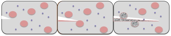 Rozprzestrzenianie się pęknięcia w materiale z mikrokapsułkami (oznaczone kolorem różowym). Kolorem fioletowym oznaczono katalizator procesu samonaprawy. Fot. Chem540f09grp11 / Wikimedia Commons