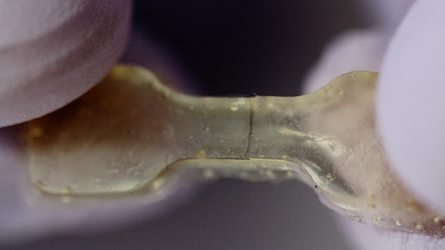 Polimer ulega naprawie nawet w temperaturze pokojowej, a powstałe połączenie jest bardzo silne. Fot. Anne Lukeman (Illinois University)