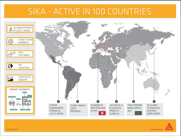 Jak podkreśla dyrektor generalny Sika, Paul Schuler, 100 filii na całym świecie to efekt ciężkiej pracy 17 000 pracowników firmy w ciągu ostatnich kilku lat. Obecnie 36% sprzedaży koncernu pochodzi z rynków wschodzących. Równocześnie Sika posiada ugruntowaną pozycję na rynkach rozwiniętych, dlatego może prężnie się rozwijać.