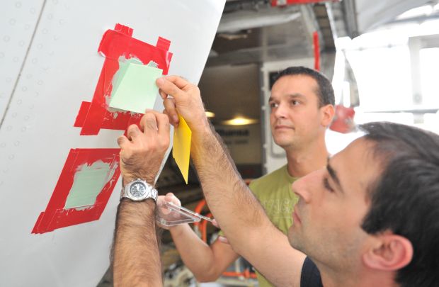 Naukowcy próbują odtworzyć strukturę skóry rekina na testowych plakietkach naklejonych na kadłub samolotu. Fot. arch. Lufthansa Technik