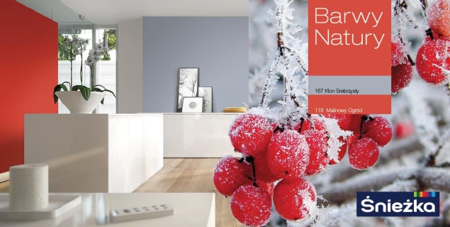 Przedwcześnie przybyła zima przyłapuje pozostałe jeszcze na gałęziach owoce jarzębiny, berberysu czy kaliny. Ich żywy, czerwony kolor pięknie współgra ze srebrzystym odcieniem szronu. W naszym salonie czy sypialni taki efekt uzyskać możemy wykorzystując farby w kolorach Malinowy Ogród oraz Klon Srebrzysty z palety Barwy Natury.