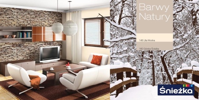 Leśne zakątki z drewnianymi mostkami przerzuconymi przez potoki to malowniczy obrazek, z którego zrodziło się trzecie połączenie kolorystyczne. Śnieżka proponuje pomalować ściany farbami w odcieniach Lilia Wodna i Górska Ścieżka, a wystrój zdominować elementami w ciepłych odcieniach brązu. Otrzymamy w ten sposób sielski, bardzo kojący nastrój.