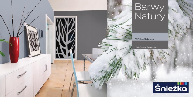 Kolejna propozycja Śnieżki została zainspirowana pokrytymi śniegiem i lodem drzewkami iglastymi. Zszarzałą od mrozu zieleń reprezentuje tutaj Cisza o Zmierzchu, zaś odcień śnieżnej pokrywy – Klon Srebrzysty. Ta kompozycja stanowi świetne tło dla nowoczesnego wystroju, ale nie jest pozbawiona związków z naturą i ładnie wpisuje się w zimowe trendy.