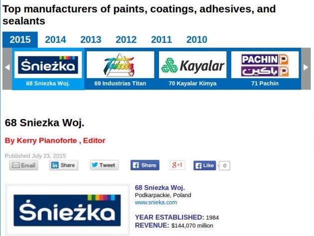 ŚnieżkaPolska firma pojawiła się na liście już w ubiegłym roku, ale oficjalnie zanotowano jej obecność wśród największych producentów farb na świecie dopiero w tegorocznym rankingu, powstałym w oparciu o przychody za rok 2014. Ze 144 mln $ przychodu Śnieżka zajęła 68. pozycję.