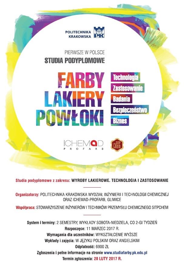 Studia „Wyroby Lakierowe: Technologia i Zastosowanie” to wspólny projekt Wydziału Inżynierii i Technologii Chemicznej Politechniki Krakowskiej oraz ICHEMAD-Profarb sp. z o.o. w Gliwicach we współpracy ze Stowarzyszeniem Inżynierów i Techników Przemysłu Chemicznego SITPChem. Po graduacji studenci otrzymują świadectwo ukończenia studiów podyplomowych Politechniki Krakowskiej. Studia trwają dwa semestry.