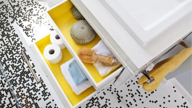 Dzięki temu pomysłowi każdy twój poranek będzie słoneczny. Pomaluj wnętrze szuflad w swojej szafce łazienkowej farbą