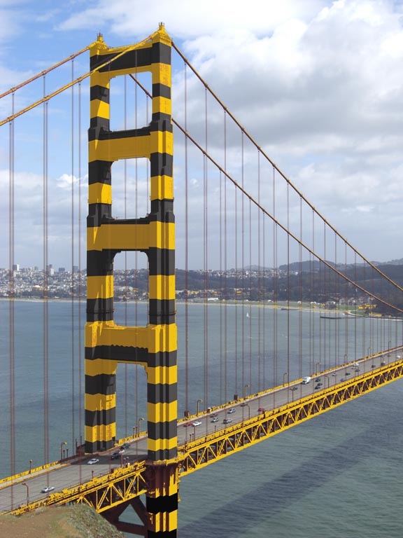 Odcień, który możemy dziś podziwiać na wieżach mostu, to International Orange. Mimo że pasiasty wzór nie pojawił się na moście, wykorzystany kolor zadowolił wojsko, już wtedy bowiem był stosowany m.in. w przemyśle lotniczym, aby uczynić niektóre elementy bardziej widocznymi. Równocześnie okazał się na tyle charakterystyczny, że z czasem stał się swego rodzaju ikoną. Więcej na temat tego odcienia przeczytać można na stronie mostu Golden Gate.