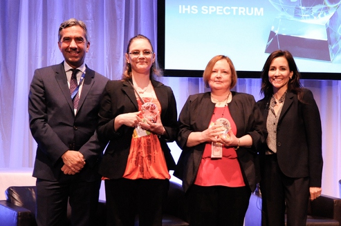 Katja Tunonen i Anu Passinen (druga i trzecia od lewej) odebrały nagrodę z rąk Steena Lomholta-Thomsona (pierwszy od lewej) i Stephanie Buscemi (z prawej), przedstawicieli IHS. Fot. IHS