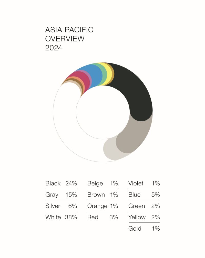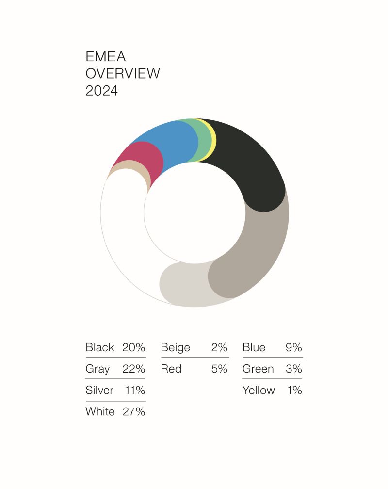 Kolory achromatyczne pozostają w tym regionie pierwszym wyborem 83% klientów, przy czym czarny, klasycznie kojarzony z elegancją, zwiększył swój udział o 2%. Z kolei popularność bieli spadła o 2%.