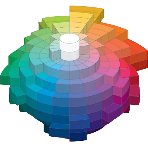Jak dokładnie wygląda model kolorystyczny RAL Design, w jaki sposób zorganizowane są w nim kolory? Można go obrazowo przedstawić jako stos ułożonych na sobie kręgów, złączonych wspólną osią. Widmo światła widzialnego, a więc poszczególne kolory (Hue), rozłożone jest na planie okręgu. Każdemu kolorowi odpowiada określony kąt, zaczynając od 0° – barwy czerwonej (znajduje się ona bowiem na skraju widma światła widzialnego, fale dłuższe to już podczerwień), poprzez 90° – żółć, 270° – niebieski, aż po fiolety znajdujące się na drugim skraju skali. Jasność (Lightness) z kolei reprezentowana jest przez „piętro”, na którym leży dany krąg nawleczony na wspólną oś. Najciemniejsze odcienie znajdują się na samym dole, najjaśniejsze – na szczycie. Przez sam środek kręgów przebiega wspólny rdzeń, który reprezentuje skalę monochromatyczną, od położonej „na parterze” czerni poprzez całą gamę szarości aż po znajdującą się na samej górze biel. Pozostaje jeszcze nasycenie (Chroma), które mierzy się po linii prostej od krawędzi kręgu do jego rdzenia. Odcienie o największym nasyceniu znajdują się na obrzeżach kręgu, najmniej nasycone – we wnętrzu.
